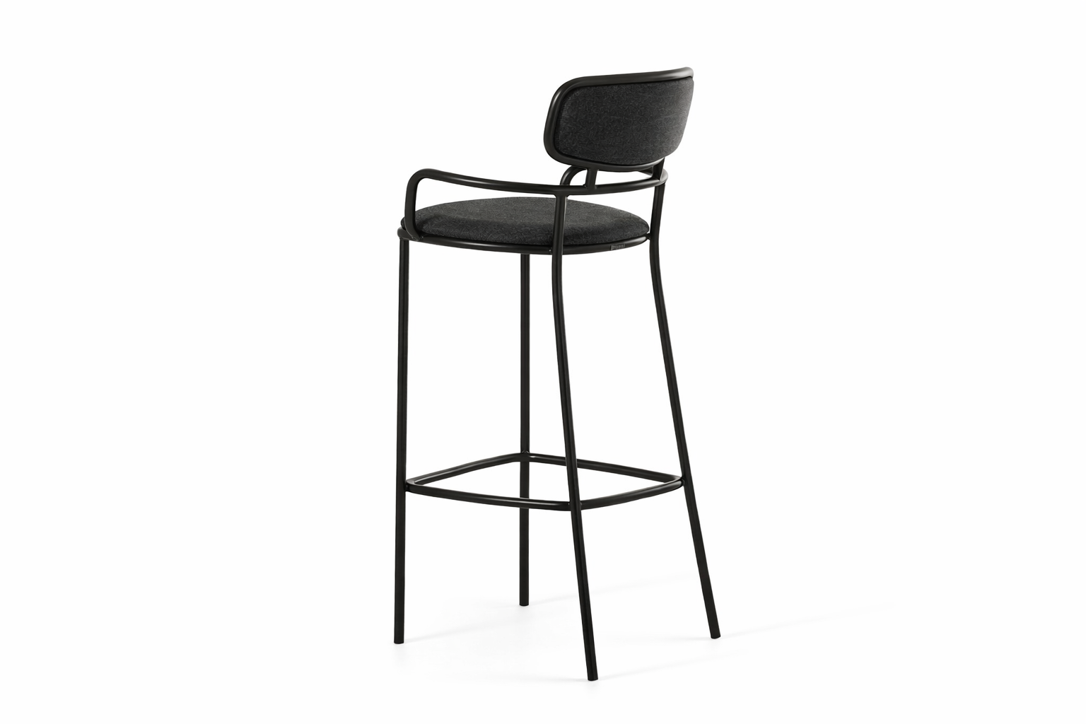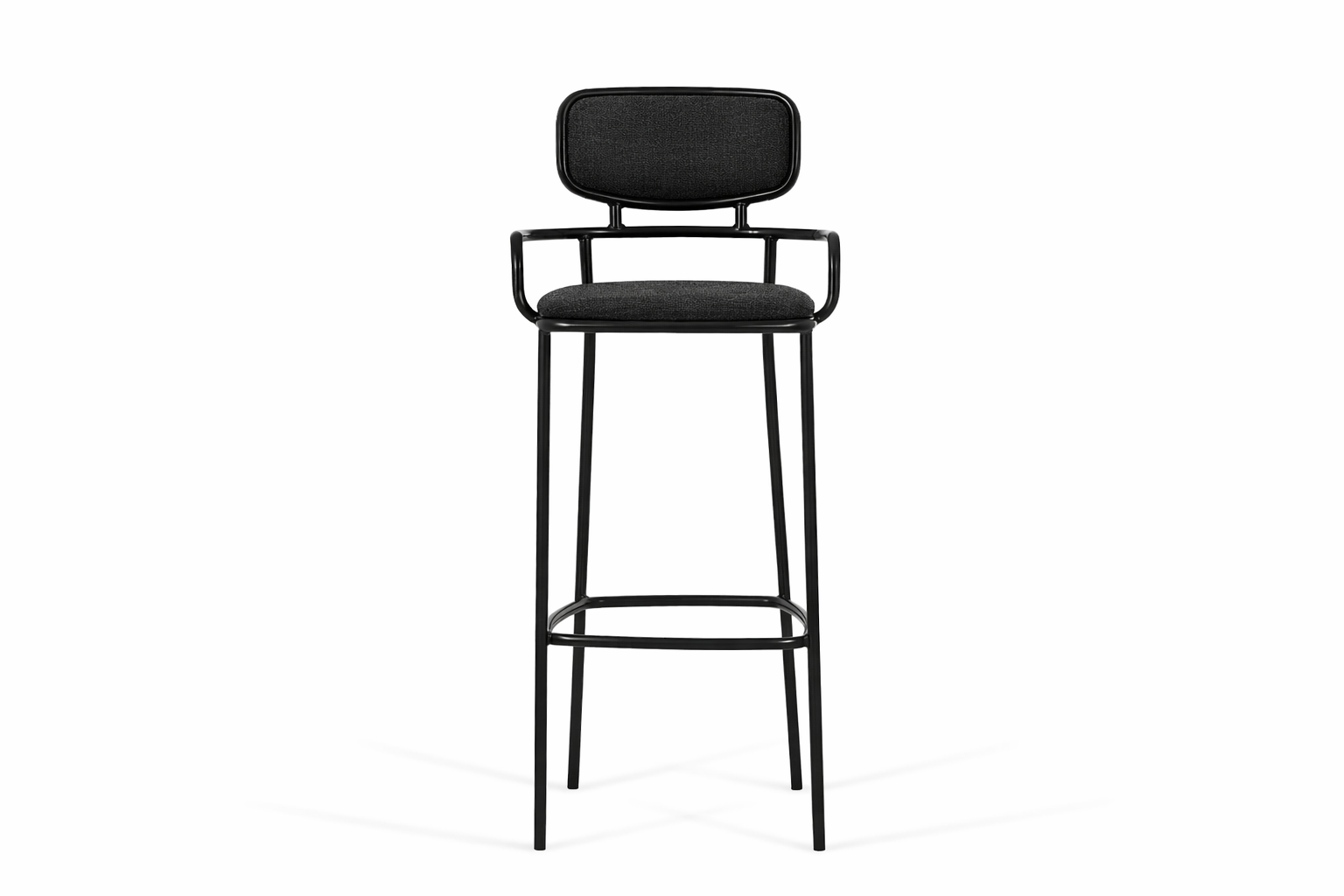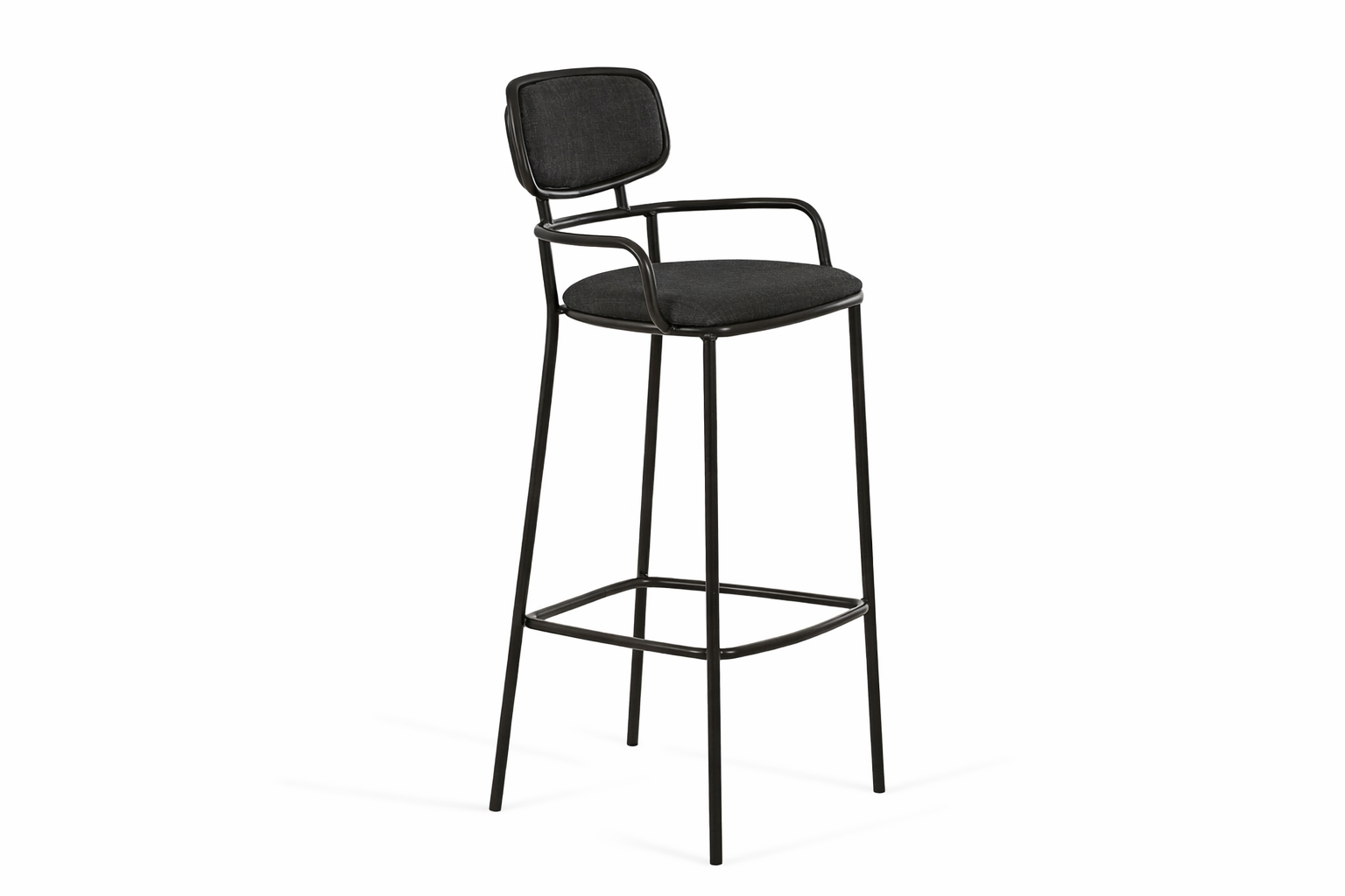A banqueta Mallon tem estrutura em metal, e seu assento e encosto possibilitam optar entre as alternativas em trefilado ou estofado.