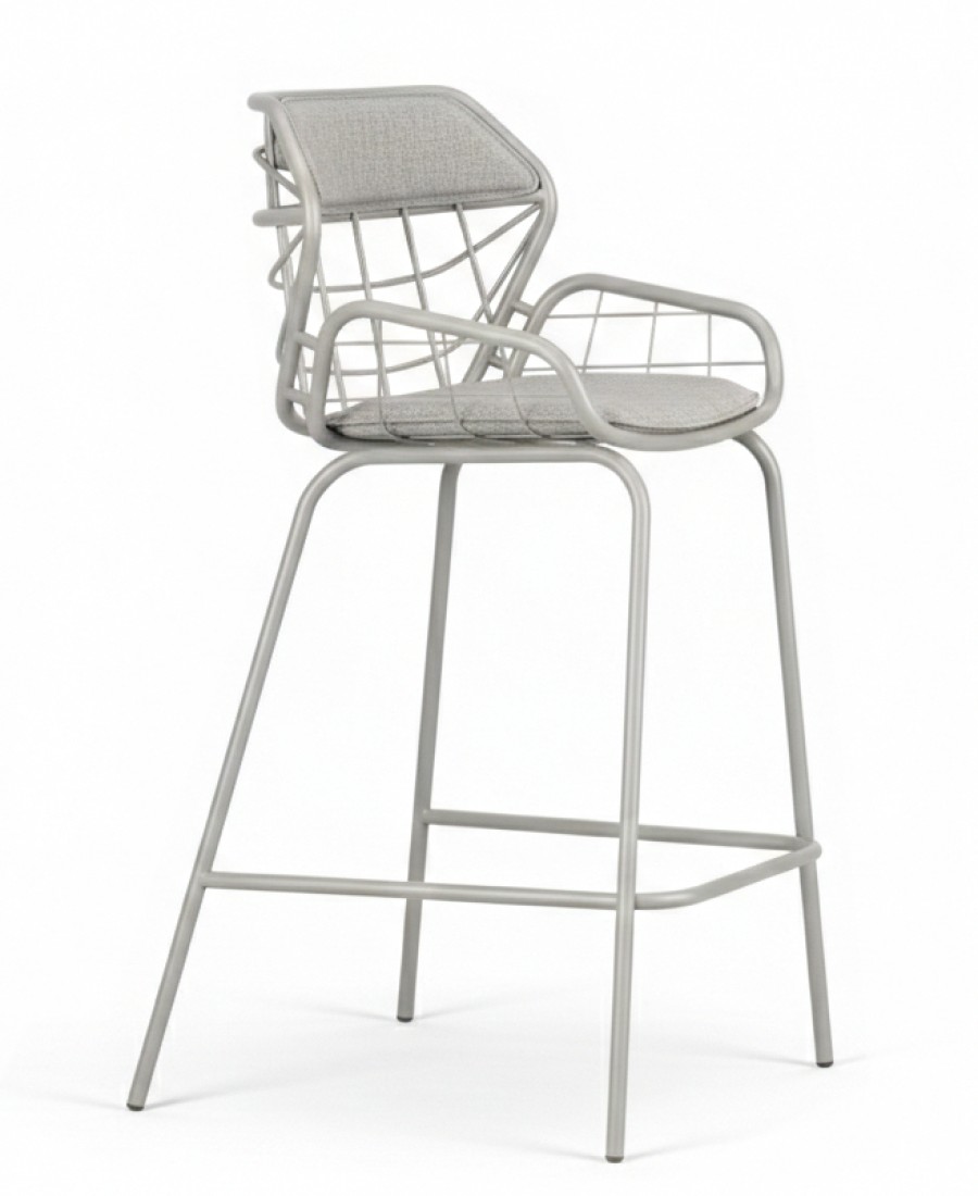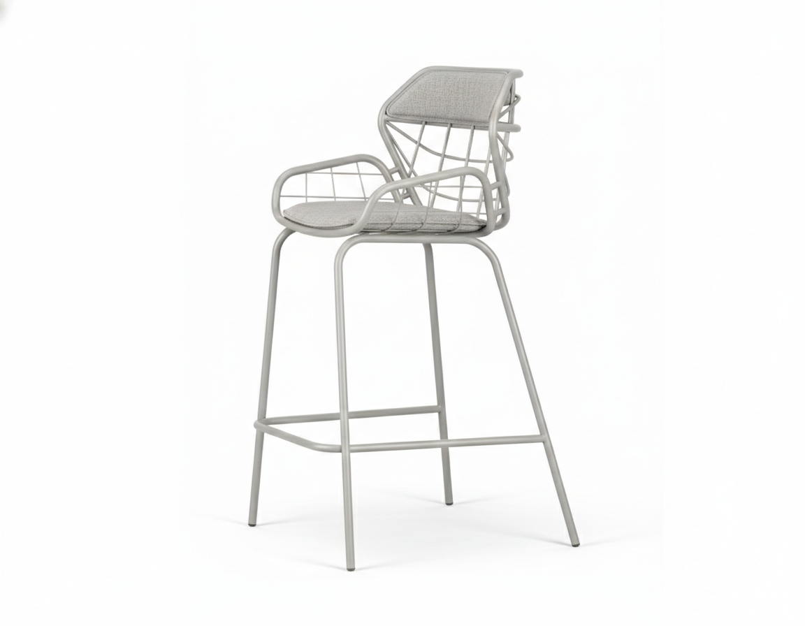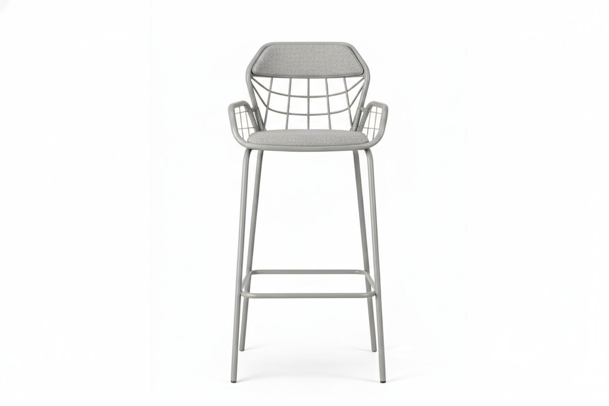 A banqueta Tracci tem estrutura em metal, e seu assento e encosto são estofados.