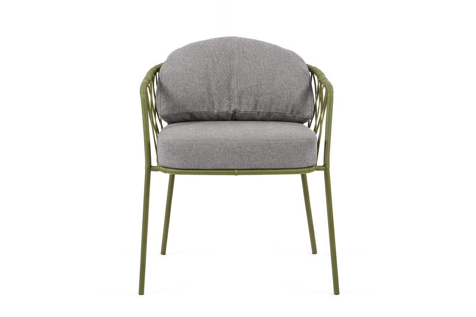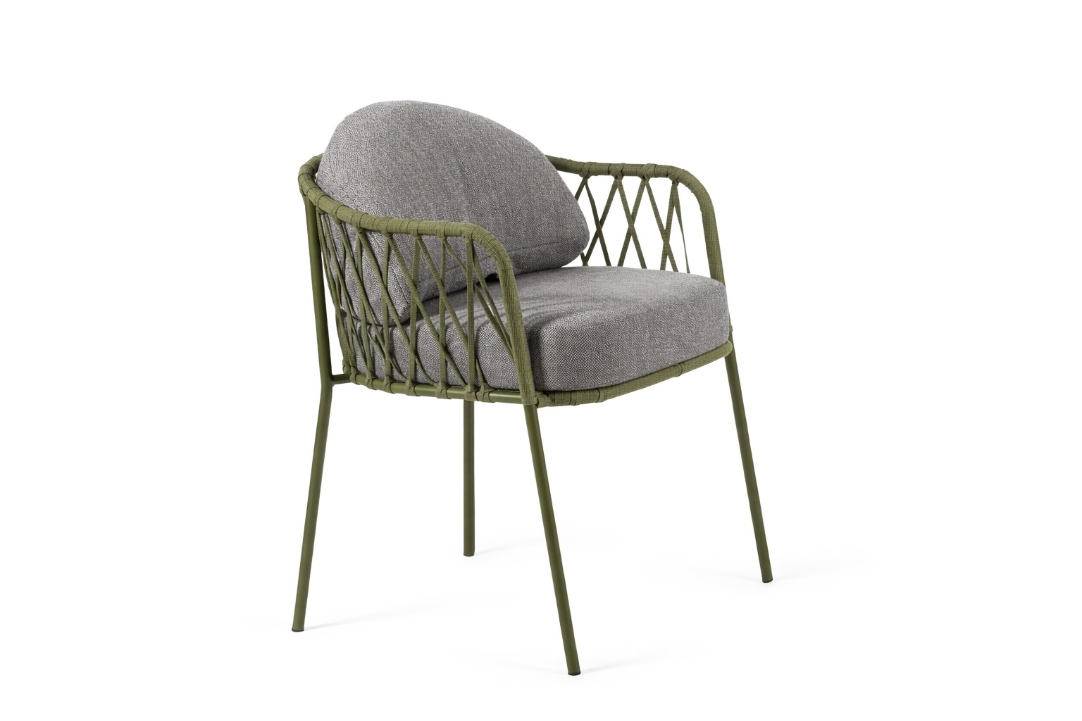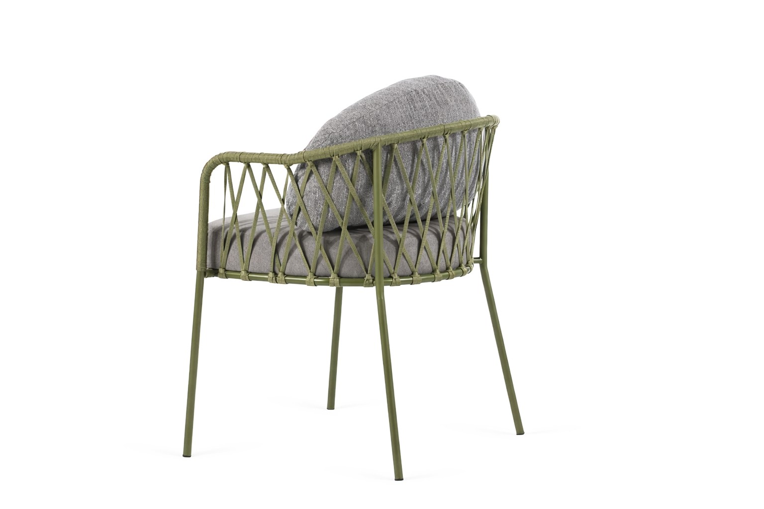 A cadeira Garden é composta por estrutura em metal somada às cordas transpassadas manualmente, e seu assento e encosto são estofados.