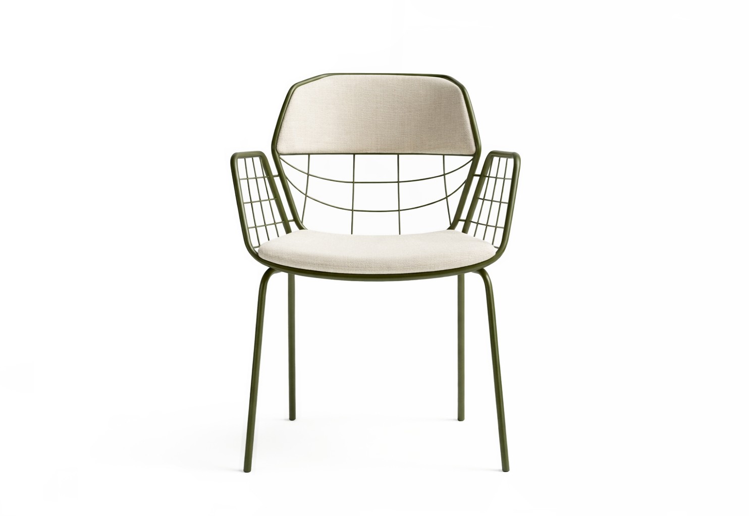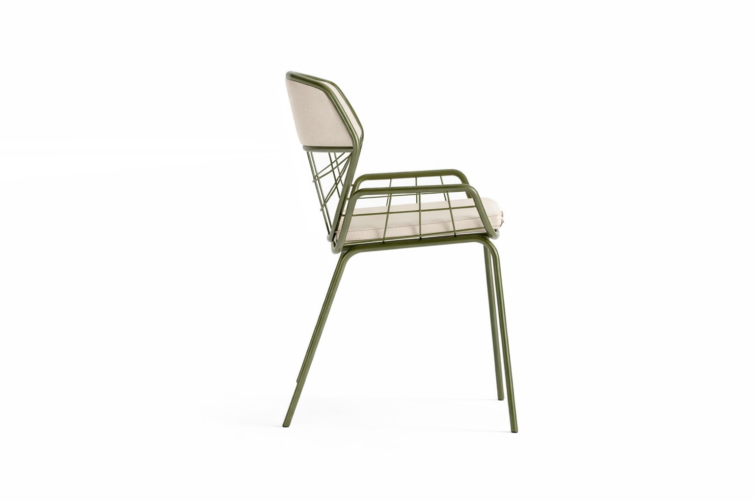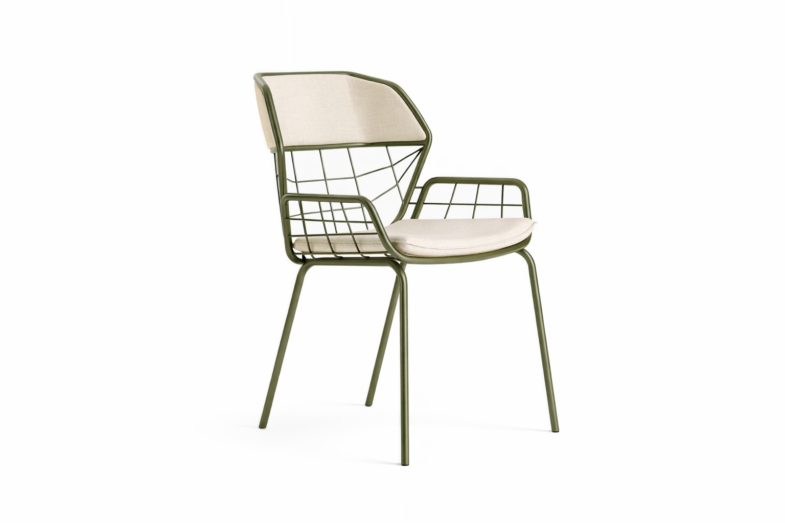 A cadeira Tracci é constituída por sua estrutura em metal, e seu encosto e assento são estofados.