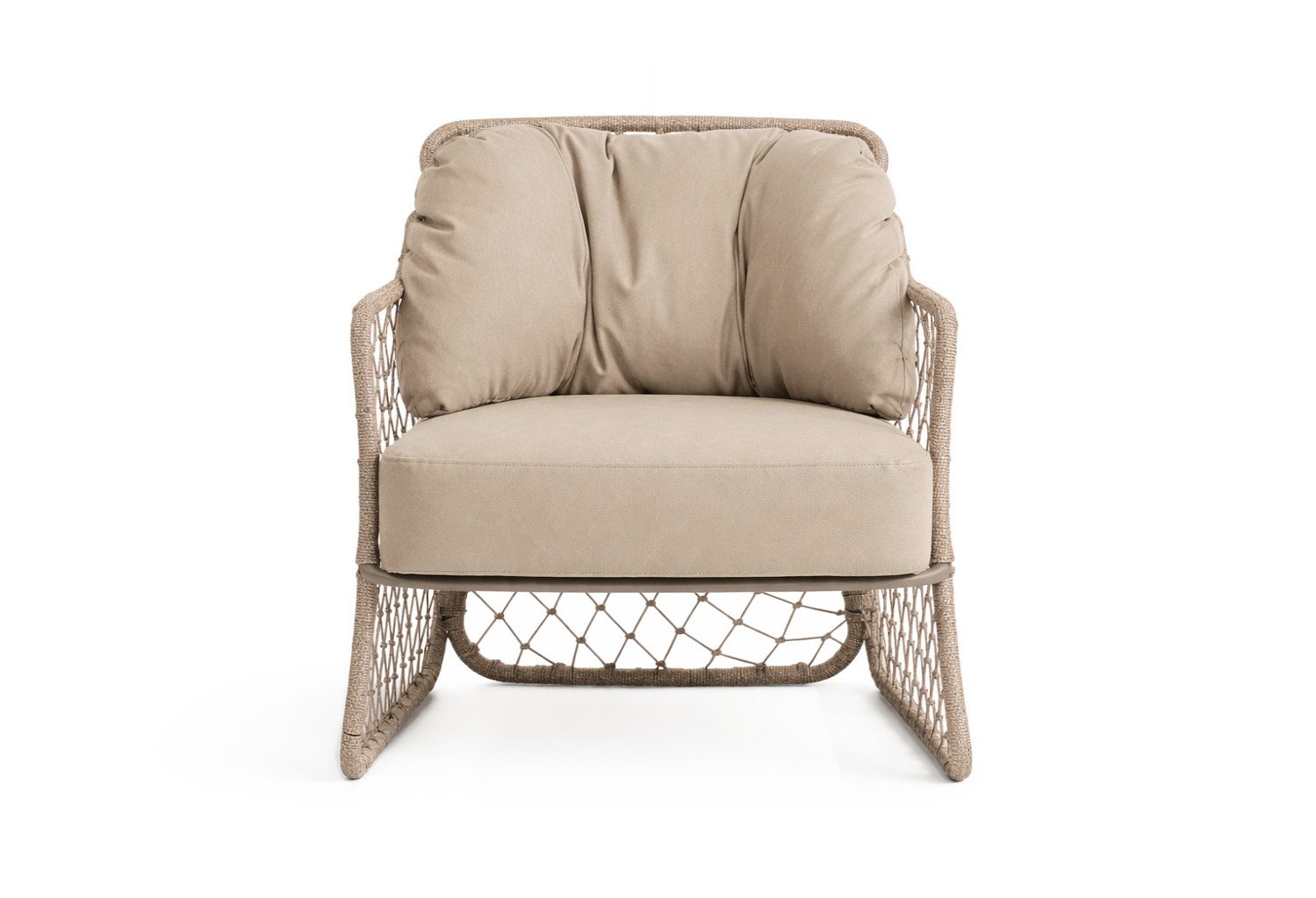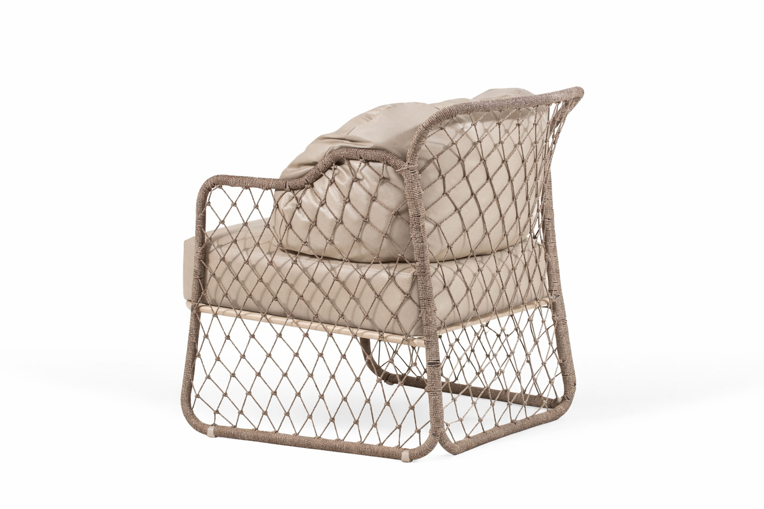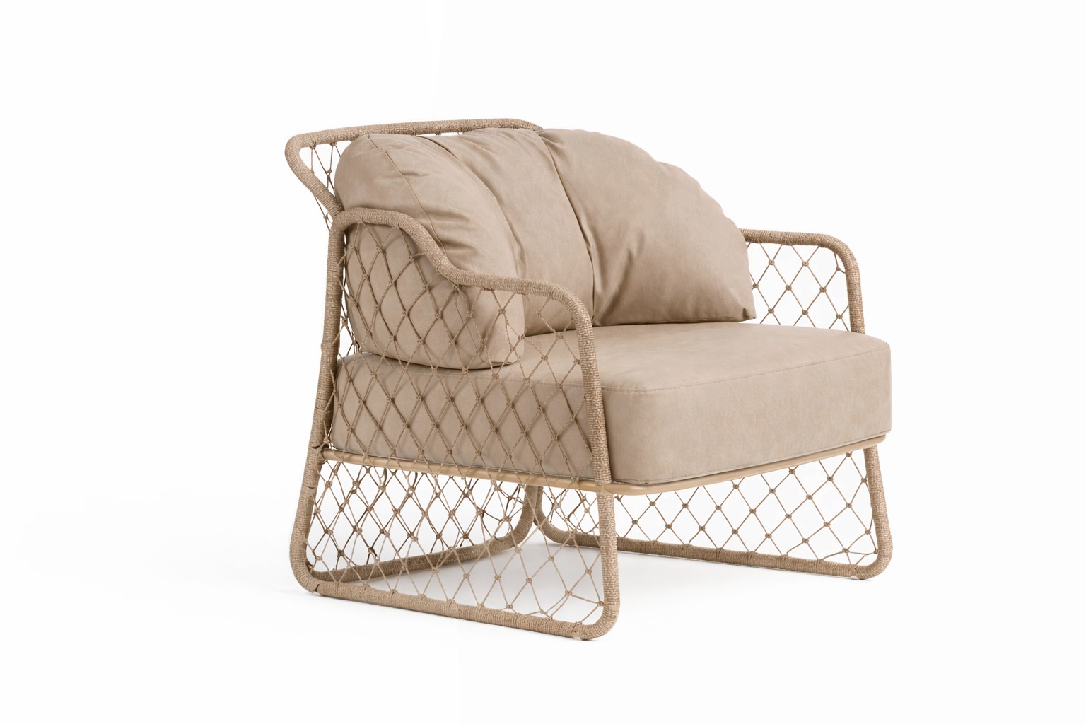 A poltrona Oásis tem sua estrutura em metal, seu assento e encosto são estofados. As cordas transpassadas manualmente adicionam requinte e identidade em sua composição.