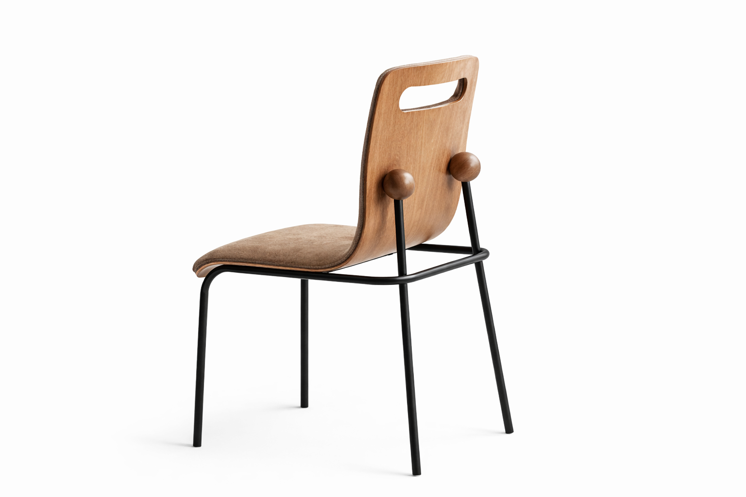 Movimentos circulares, formas esféricas e linhas marcadas determinam o conceito de órbita da cadeira de jantar Ball. O detalhe das esferas na parte posterior guiadas e marcadas pelas formas em aço parece conduzir por linhas e caminhos que configuram os elementos formais marcantes da peça.